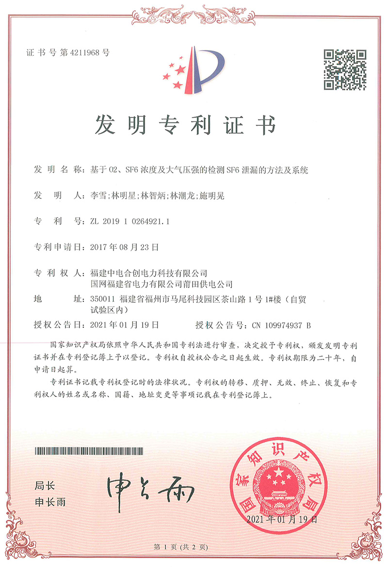基于O2、SF6濃度及大氣壓強的檢測SF6泄漏的方法及系統發明專利證書